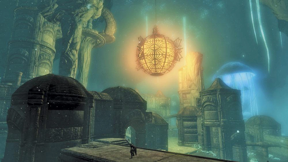 Like most other Dwemer cities, it now lies in ruin, overrun by Falmer, Chaurus, and full of glowing mushrooms. Some of the glowing mushrooms here are substantially larger than those found elsewhere, with stalks taller than buildings. The ceiling of the entire cave system glows with blue bioluminescent lights, and massive glowing vines that hang down, as well as some that "float" upwards near the Raldbthar Deep Market. There is a teal fog within Blackreach that makes grasping the size of Blackreach difficult, and mushroom spores that float throughout the air. Massive geode stones and geode veins also dot the ground, and the pools of water found within are an almost entirely opaque teal.